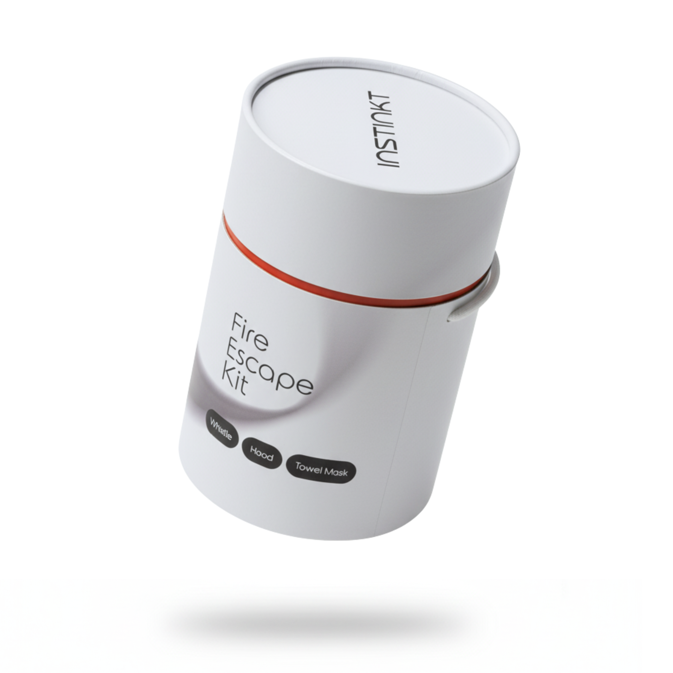 EV2 is the most simplified version in the INSTINKT lineup, designed for maximum ease, discretion, and functionality. Packaged in a sleek cylinder tube, it blends seamlessly into any space while remaining instantly accessible in emergencies. Inside, it contains the essential core: a certified fire escape hood mask, an emergency towel mask, and a titanium signal whistle, providing immediate protection and signaling capability when seconds matter.